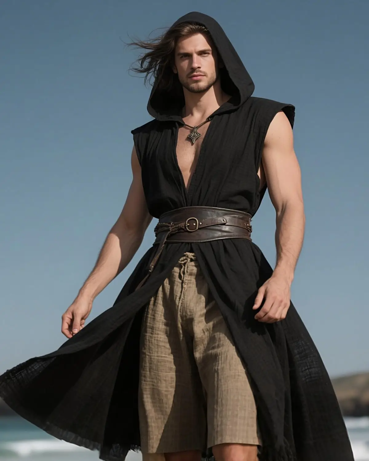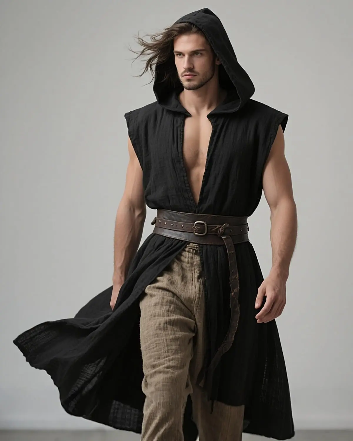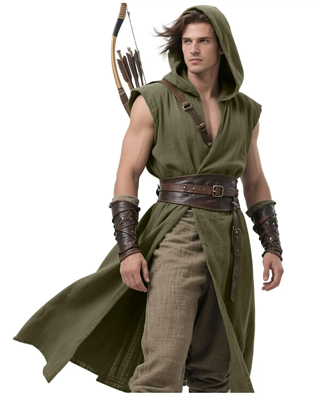 Men's Medieval Hooded Surcoat Renaissance Tabard Sleeveless Tunic Cloak Viking Costume Holloween Assassin Cosplay